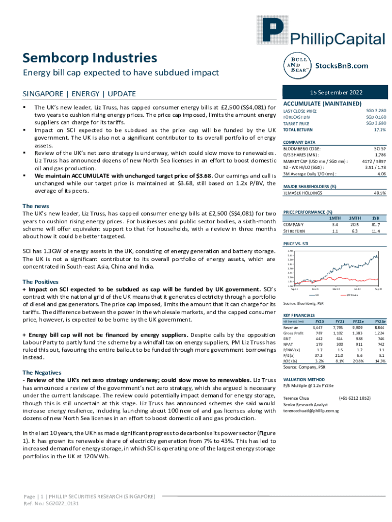 Sembcorp Industries Energy bill cap expected to have subdued impact 15 September 2022SINGAPORE | ENERGY | UPDATE The UKs new leader, Liz Truss, has capped consumer energy bills at 2,500 (S$4,081)