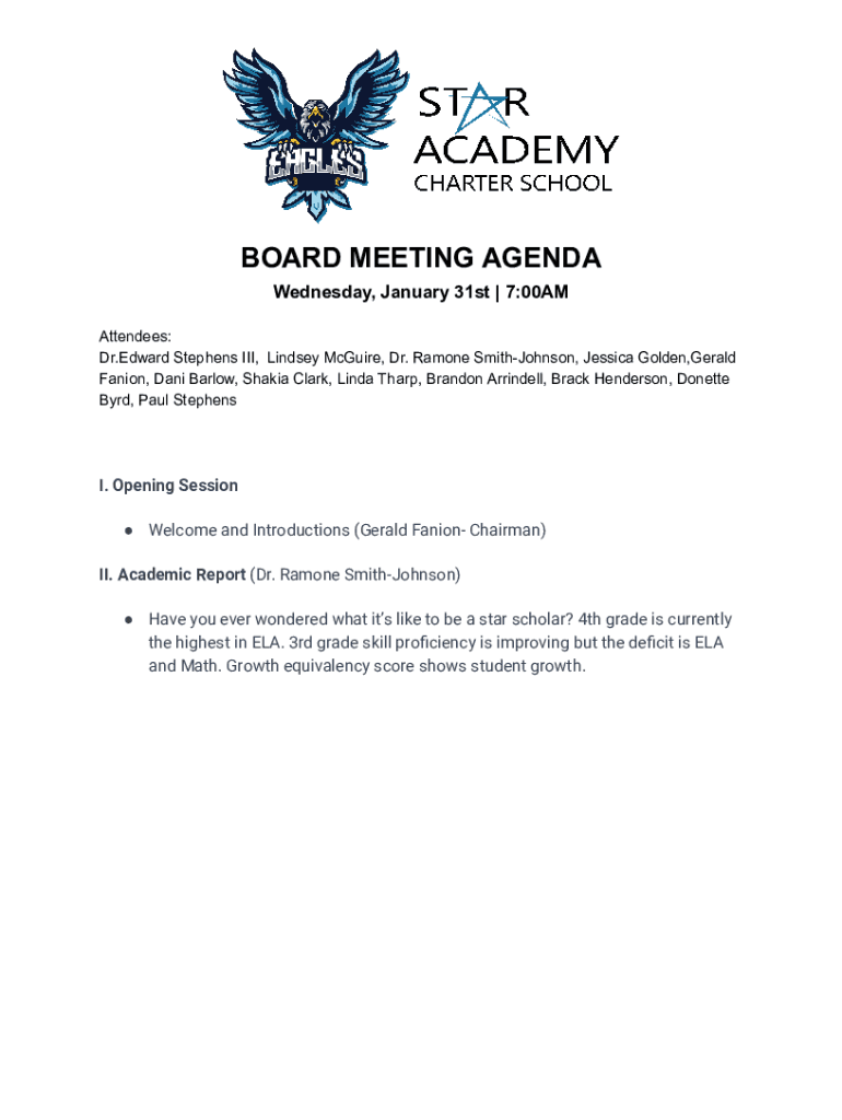 BOARD MEETING AGENDA Wednesday, January 31st | 7:00AM Attendees: Dr.Edward Stephens III, Lindsey McGuire, Dr. Ramone SmithJohnson, Jessica Golden,Gerald Fanion, Dani Barlow, Shakia Clark, Linda Tharp,