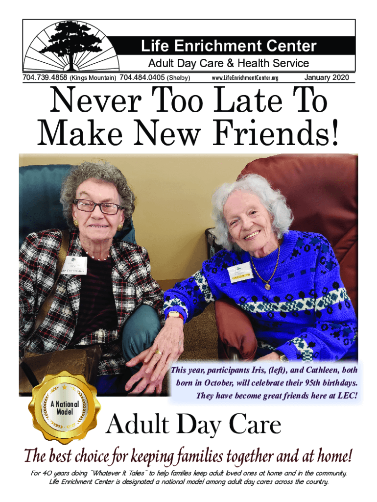 Life Enrichment Center Adult Day Care & Health ServiceNever Too Late To Make New Friends!704.739.4858 (Kings Mountain) 704.484.0405 (Shelby)A National Modelwww.LifeEnrichmentCenter.orgJanuary 2020This