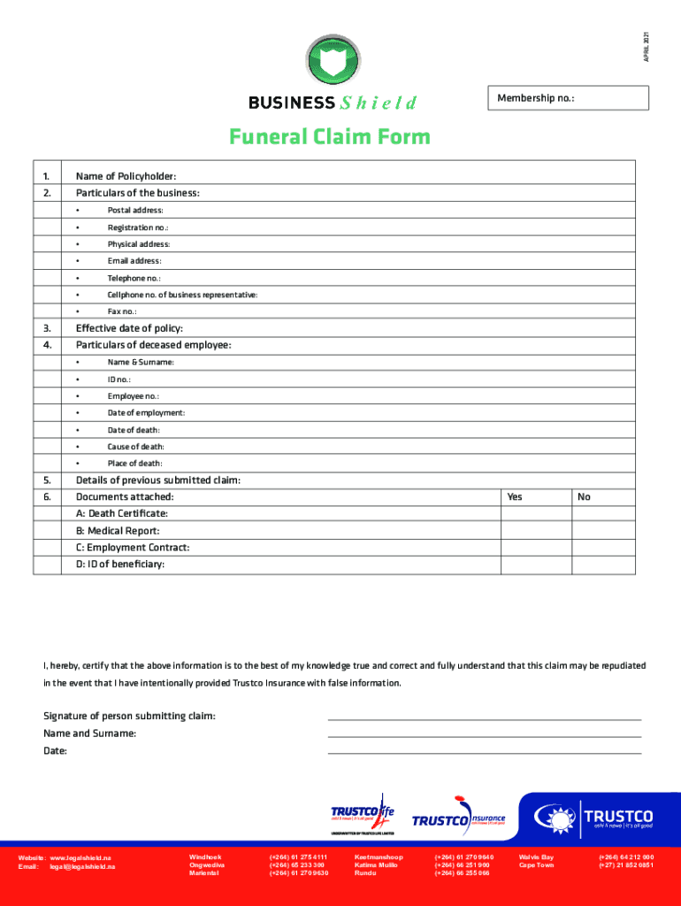 APRIL 2021Membership no.:Funeral Claim Form 1.Name of Policyholder:2.Particulars of the business: Postal address:Registration no.:Physical address:Email address:Telephone no.:Cellphone no. of business