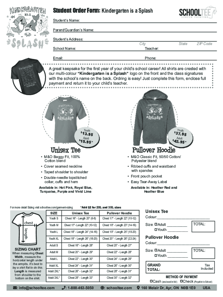 Student Order Form: Kindergarten is a Splash Students Name: Parent/Guardians Name: Students Address: City Teacher:School Name: Email:StateZIP CodePhone:Agreatkeepsakeforthefirstyearofyourchildsschoolcareer!Allshirtsarecrestedwith