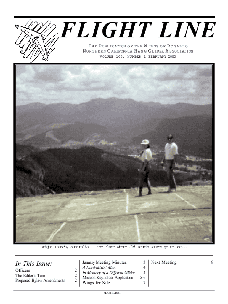 FLIGHT LINE TH E P UBLICATION O F T H E W INGS O F R O G A L L O N O R T H E R N C ALIFORNIA H A N G G LIDER A SSOCIATION VOLUME 103, NUMBER 2 FEBRUARY 2003Bright Launch, Australia the Place Where
