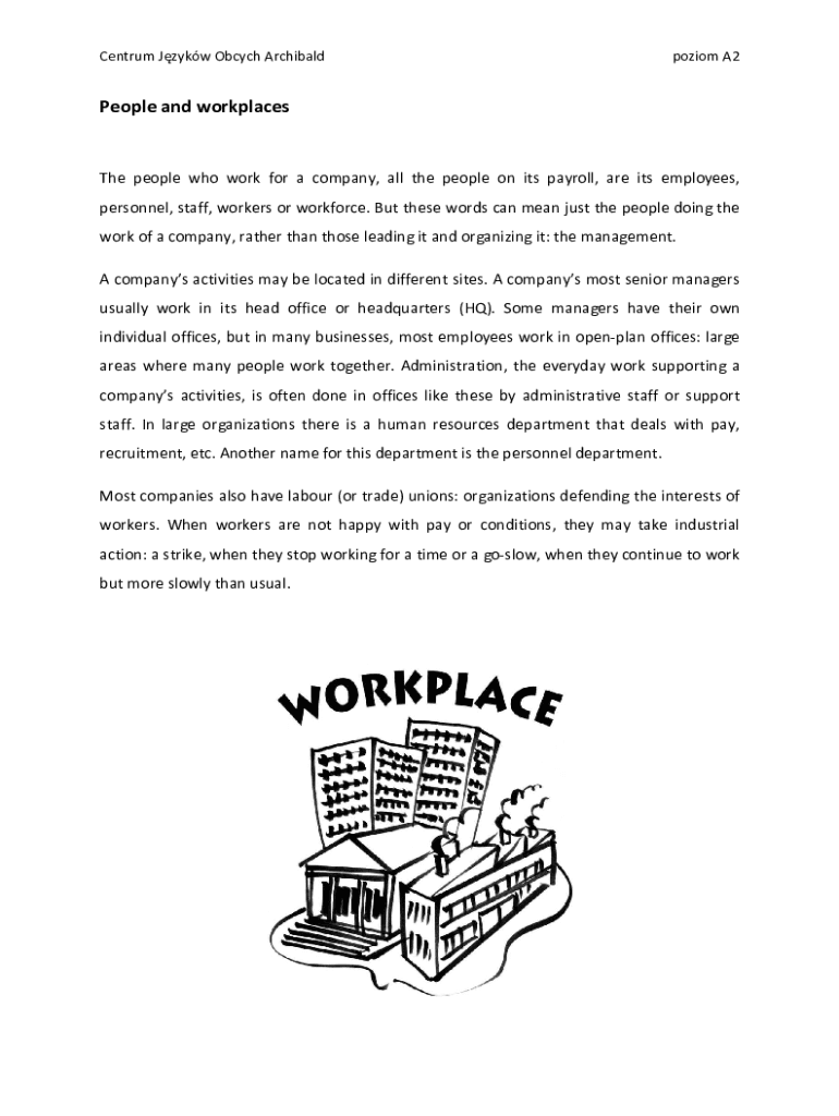 Centrum Jzykw Obcych Archibaldpoziom A2People and workplacesThe people who work for a company, all the people on its payroll, are its employees, personnel, staff, workers or workforce. But these words
