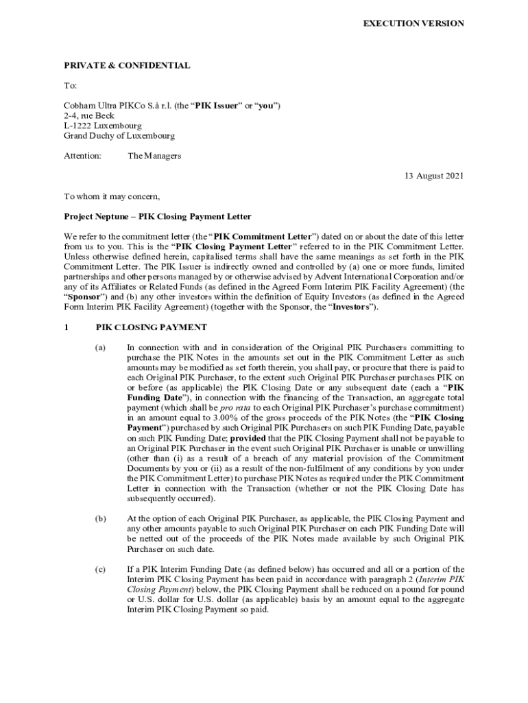 EXECUTION VERSIONPRIVATE & CONFIDENTIAL To: Cobham Ultra PIKCo S. r.l. (the PIK Issuer or you) 24, rue Beck L1222 Luxembourg Grand Duchy of Luxembourg Attention:The Managers 13 August 2021To whom