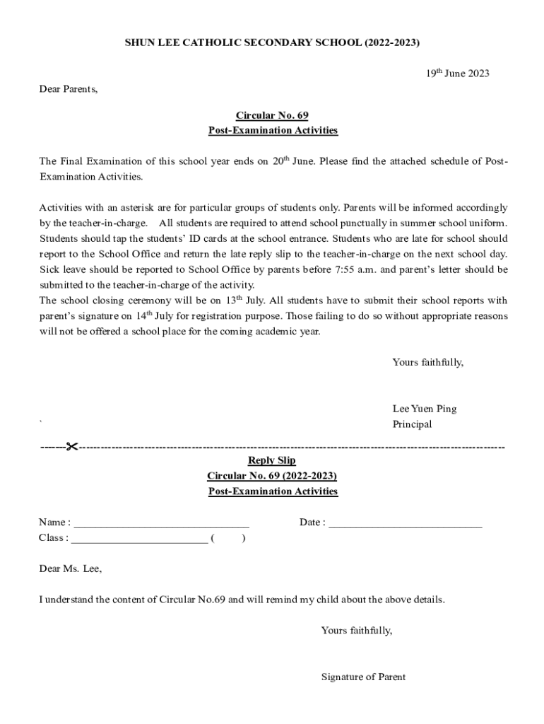 SHUN LEE CATHOLIC SECONDARY SCHOOL (20222023) 19th June 2023 Dear Parents, Circular No. 69 PostExamination Activities The Final Examination of this school year ends on 20th June. Please find the attached