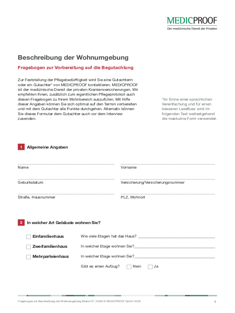 Beschreibung der Wohnumgebung Fragebogen zur Vorbereitung auf die Begutachtung Zur Feststellung der Pflegebedrftigkeit wird Sie eine Gutachterin oder ein Gutachter* von MEDICPROOF kontaktieren. MEDICPROOF