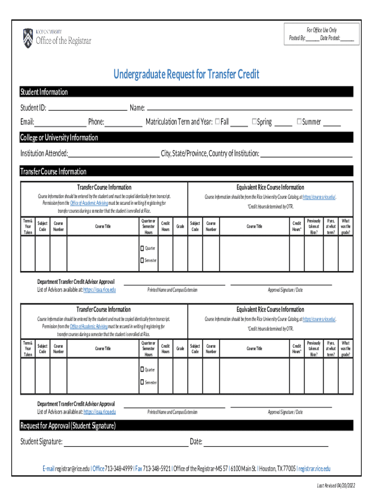 For Office Use Only Posted By: ___ Date Posted: ___Undergraduate Request for Transfer Credit Student Information Student ID:Name:Email:Phone:Matriculation Term and Year: Fall Spring SummerCollege