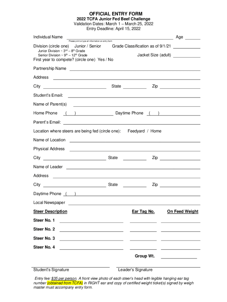 OFFICIAL ENTRY FORM 2022 TCFA Junior Fed Beef Challenge Validation Dates: March 1 March 25, 2022 Entry Deadline: April 15, 2022 Individual NameAge Please print or type all information on entry formDivision
