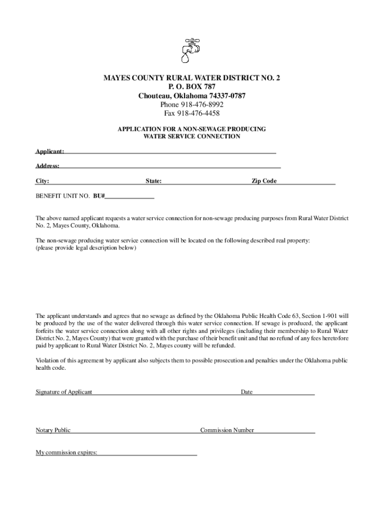 MAYES COUNTY RURAL WATER DISTRICT NO. 2 P. O. BOX 787 Chouteau, Oklahoma 743370787 Phone 9184768992 Fax 9184764458 APPLICATION FOR A NONSEWAGE PRODUCING WATER SERVICE CONNECTION Applicant: Address: