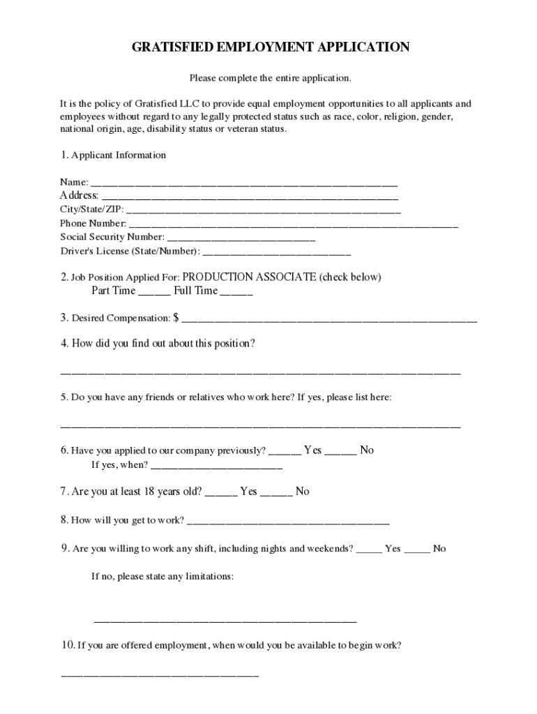 GRATISFIED EMPLOYMENT APPLICATION Please complete the entire application. It is the policy of Gratisfied LLC to provide equal employment opportunities to all applicants and employees without regard
