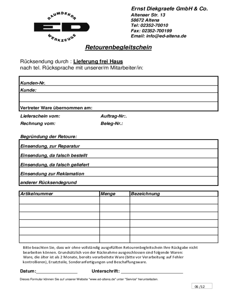 Ernst Diekgraefe GmbH & Co. Altenaer Str. 13 58672 Altena Tel: 0235270010 Fax: 02352700199 Email: info@edaltena.deRetourenbegleitschein Rcksendung durch : Lieferung frei Haus nach tel. Rcksprache