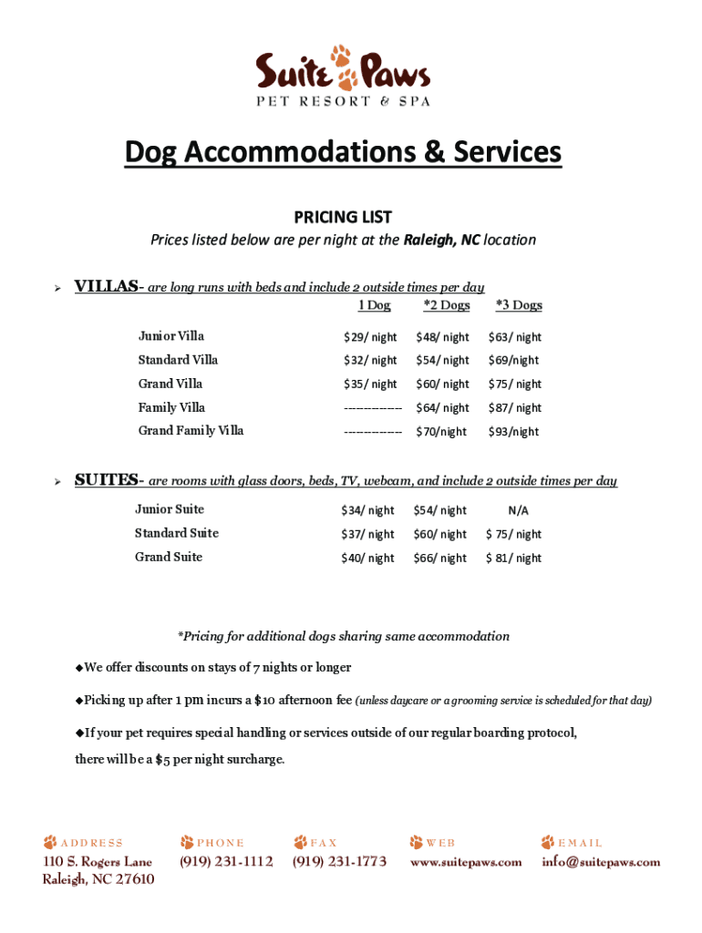 Dog Services Application Dog Accommodations & ServicesSuite Paws must have proof of vaccines BEFORE boarding any dog. No exceptions.Date:/PRICING LIST/Prices listed below are per night at the Raleigh,