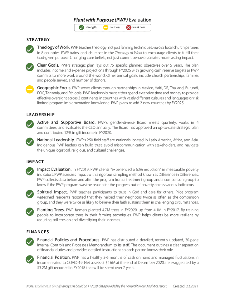 Plant with Purpose (PWP) Evaluation strengthcautionweaknessS T RA T EG Y Theology of Work. PWP teaches theology, not just farming techniques, via 683 local church partners in 8 countries. PWP trains