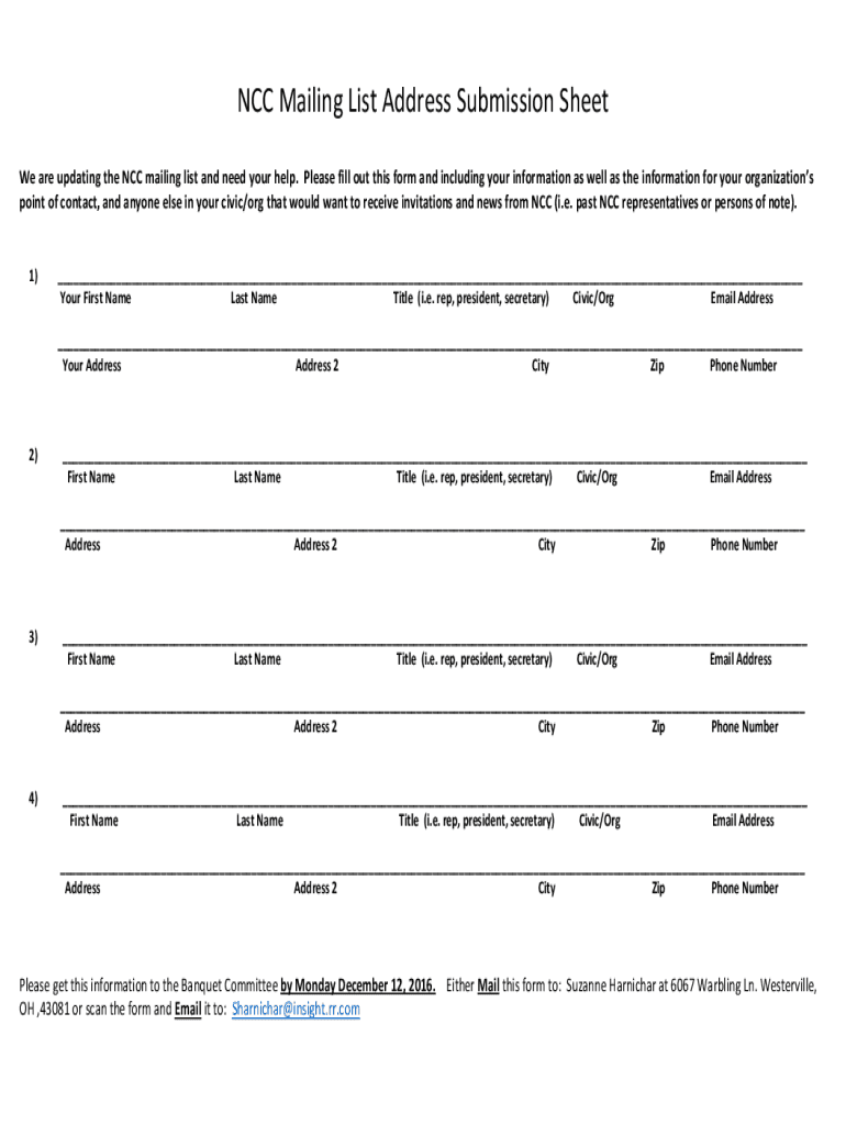 NCC Mailing List Address Submission Sheet We are updating the NCC mailing list and need your help. Please fill out this form and including your information as well as the information for your organizations