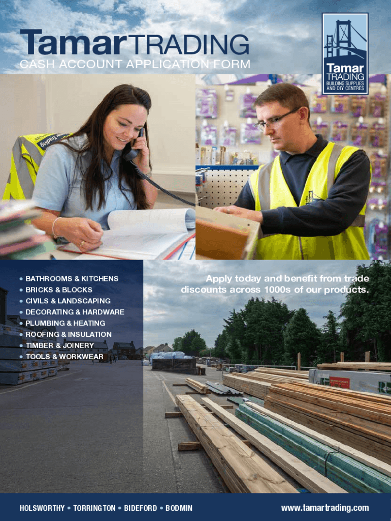 Tamar TRADINGCASH ACCOUNT APPLICATION FORM BATHROOMS & KITCHENS BRICKS & BLOCKS CIVILS & LANDSCAPINGApply today and benefit from trade discounts across 1000s of our products. DECORATING & HARDWARE