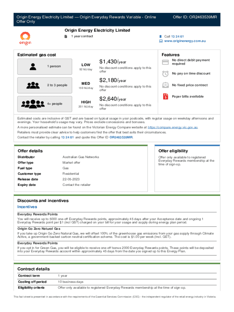 Origin Energy Electricity Limited Origin Everyday Rewards Variable Online Offer OnlyOffer ID: OR2463539MROrigin Energy Electricity Limited 1 year contractCall 13 24 61 www.originenergy.com.auEstimated