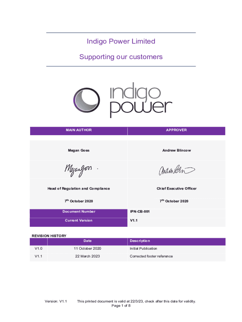 Indigo Power Limited Supporting our customersMAIN AUTHORAPPROVERMegan GossAndrew BlincowHead of Regulation and ComplianceChief Executive Officer7th October 2020 Document Number Current Version7th