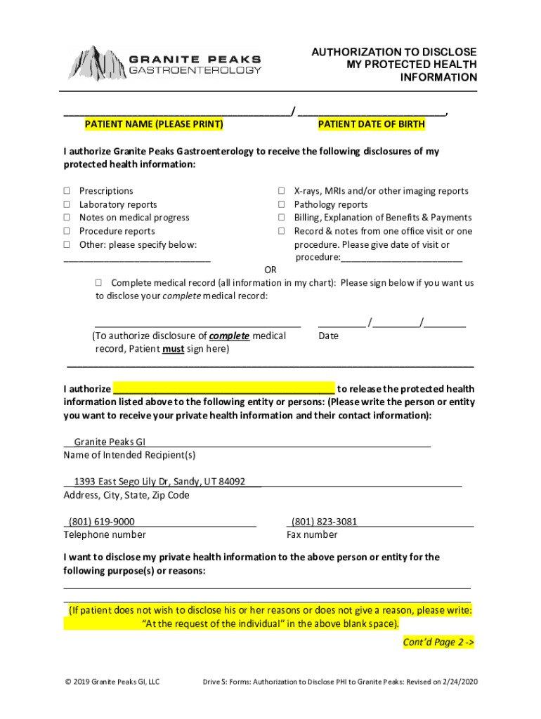 IauthorizeGranitePeaksGastroenterologytoreceivethefollowingdisclosuresofmy
