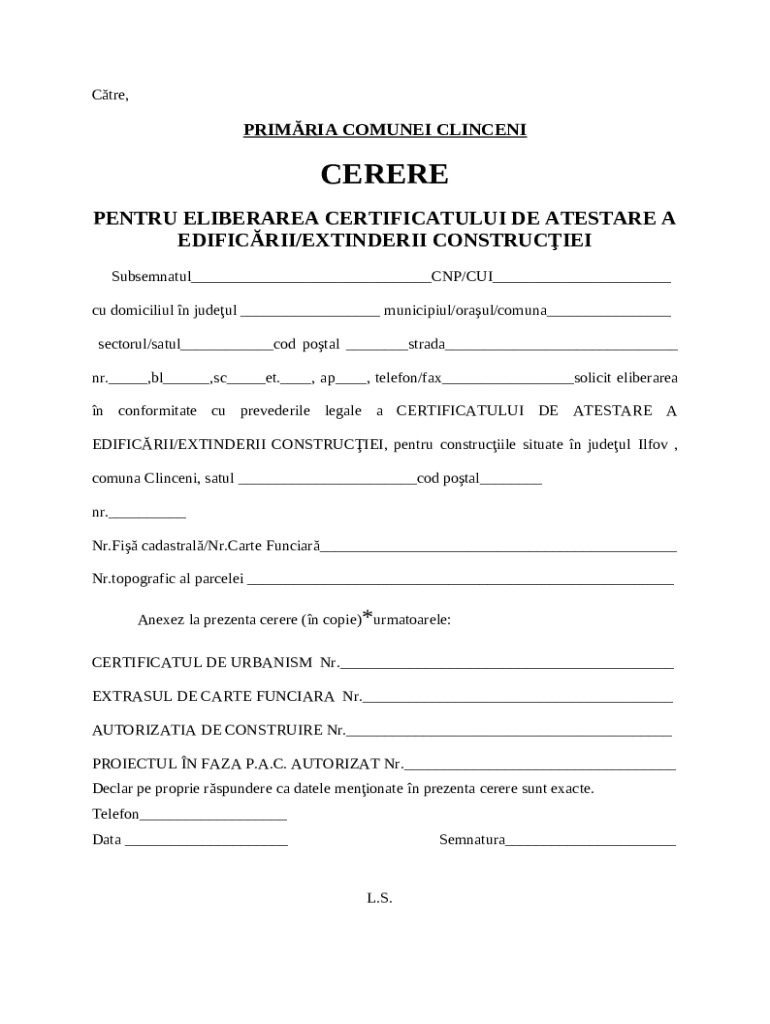 The CERERE TIP - CERTIFICAT DE ATESTARE A EDIFICARII- ... is a writable document which can be completed and signed for specific reasons. Then, it is furnished to the actual addressee in order to provide some info of certain kinds. The completion and signing is available in hard copy by hand or with a suitable solution e. g. PDFfiller. Such applications help to submit any PDF or Word file online. While doing that, you can customize its appearance depending on your requirements and put legit digital signature. Upon finishing, the user ought to send the CERERE TIP - CERTIFICAT DE ATESTARE A EDIFICARII- ... to the recipient or several of them by email and also fax. PDFfiller has a feature and options that make your blank printable. It includes a variety of options when printing out appearance. It doesn't matter how you'll distribute a form - in hard copy or electronically - it will always look professional and clear. In order not to create a new writable document from the beginning over and over, turn the original form as a template. After that, you will have a customizable sample.