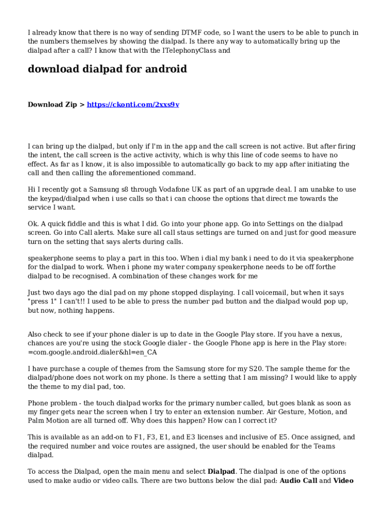 You can edit, sign, and distribute skype tone dialing dtmf on your mobile device from anywhere using the pdfFiller mobile app for Android; all you need is an internet connection. Download the app and begin streamlining your document workflow from anywhere.