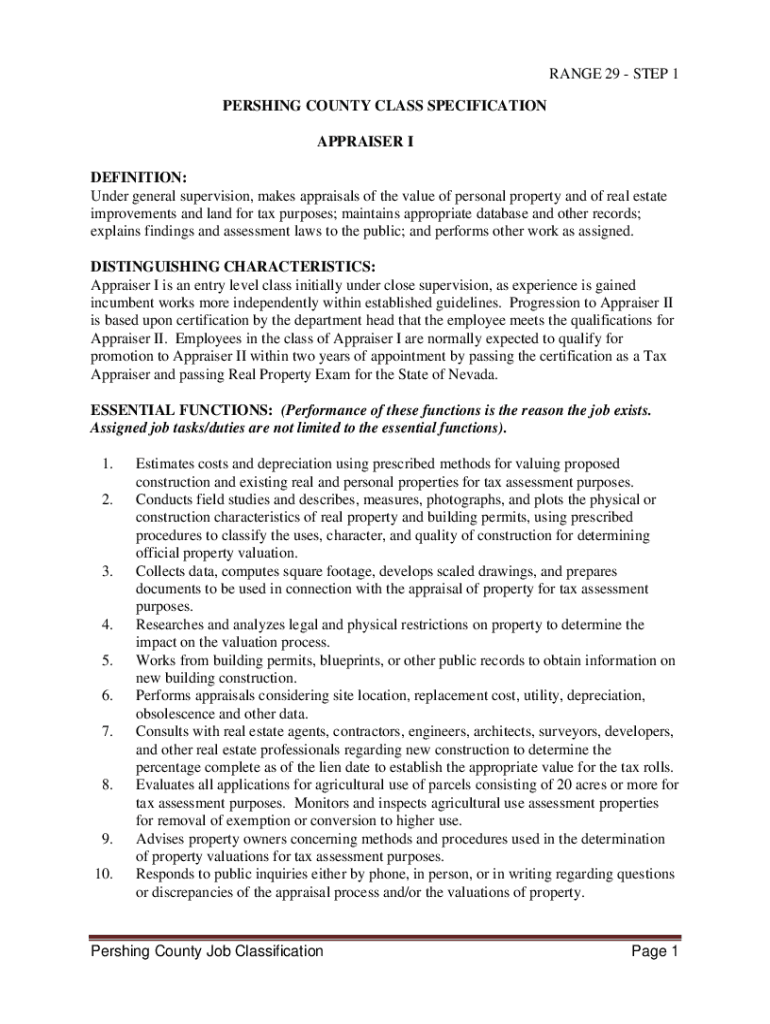 RANGE 29 STEP 1 PERSHING COUNTY CLASS SPECIFICATION APPRAISER I DEFINITION: Under general supervision, makes appraisals of the value of personal property and of real estate improvements and land for