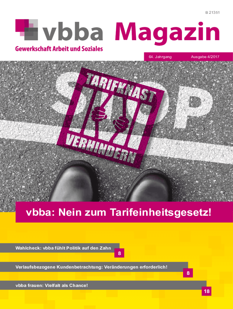B 21351Magazin 64. JahrgangAusgabe 4/2017vbba: Nein zum Tarifeinheitsgesetz! Wahlcheck: vbba fhlt Politik auf den Zahn8Verlaufsbezogene Kundenbetrachtung: Vernderungen erforderlich!vbba frauen: Vielfalt