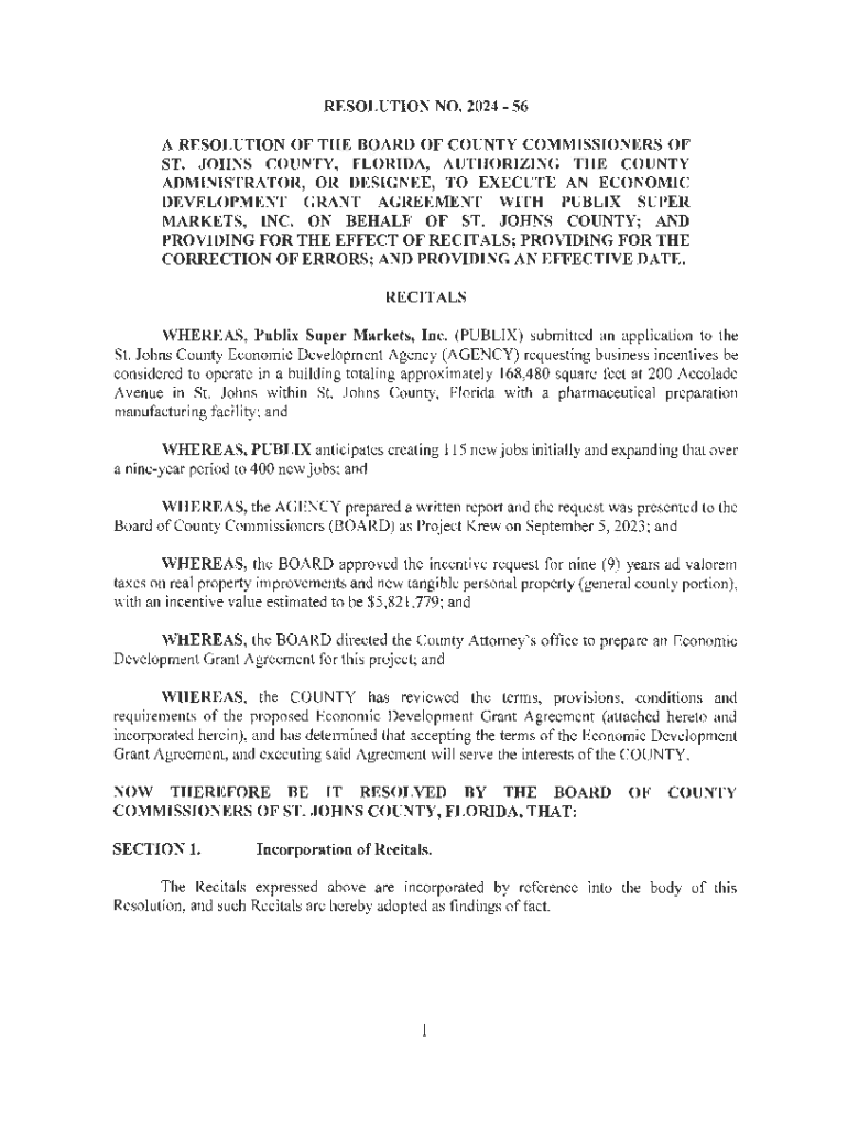 RESOLUTION NO. 2024 56 A RESOLUTION OF THE BOARD OF COUNTY COMMISSIONERS OF ST. JOHNS COUNTY, FLORIDA, AUTHORIZING THE COUNTY ADMINISTRATOR, OR DESIGNEE, TO EXECUTE AN ECONOMIC DEVELOPMENT GRANT AGREEMENT