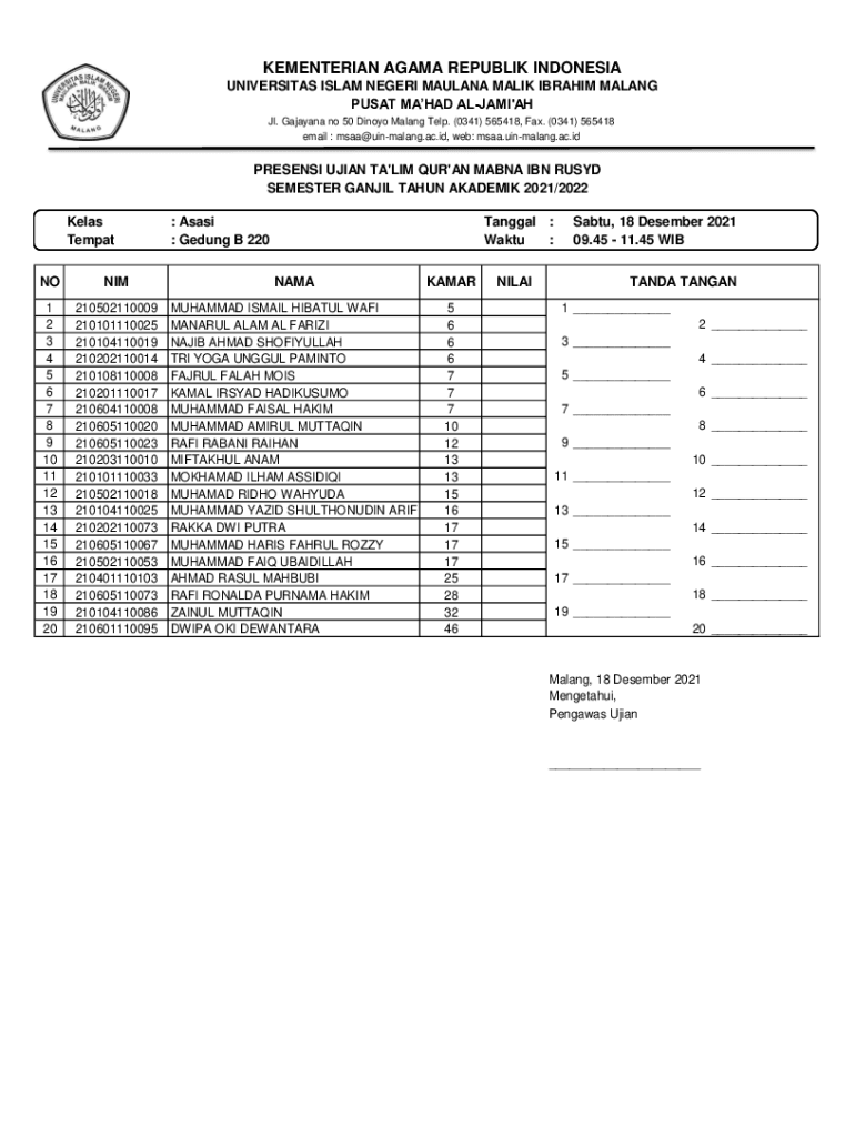 KEMENTERIAN AGAMA REPUBLIK INDONESIA UNIVERSITAS ISLAM NEGERI MAULANA MALIK IBRAHIM MALANG PUSAT MAHAD ALJAMI\'AH Jl. Gajayana no 50 Dinoyo Malang Telp. (0341) 565418, Fax. (0341) 565418 email : msaa@uinmalang.ac.id,