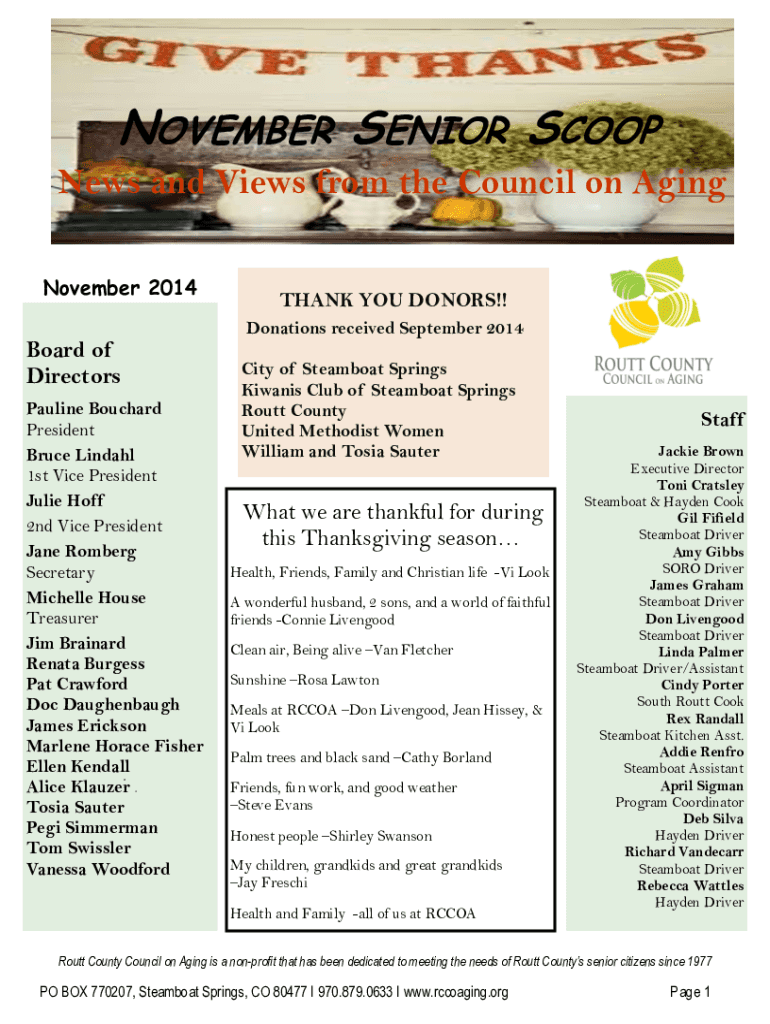 NOVEMBER SENIOR SCOOP News and Views from the Council on Aging November 2014Board of Directors Pauline Bouchard President Bruce Lindahl 1st Vice President Julie Hoff 2nd Vice President Jane Romberg