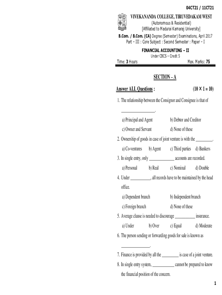 04CT21 / 11CT21VIVEKANANDA COLLEGE, TIRUVEDAKAM WEST (Autonomous & Residential) [Affiliated to Madurai Kamaraj University] B.Com. / B.Com. (CA) Degree (Semester) Examinations, April 2017 Part III