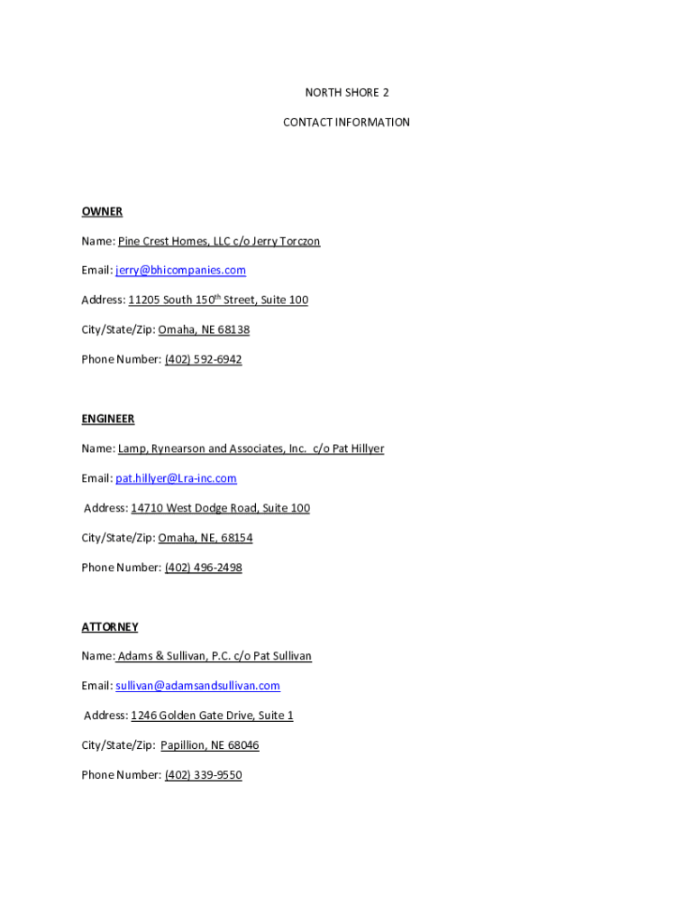 NORTH SHORE 2 CONTACT INFORMATIONOWNER Name: Pine Crest Homes, LLC c/o Jerry Torczon Email: jerry@bhicompanies.com Address: 11205 South 150th Street, Suite 100 City/State/Zip: Omaha, NE 68138 Phone