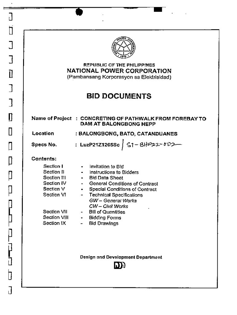 ]Q 3 3 D 3 3 D D 3D PREPUBLIC OF THE PHILIPPINESNATIONAL POWER CORPORATION (Pambansang Korporasyon sa Elektrlsidad)BID DOCUMENTS Name of Project Location Specs No.CONCRETING OF PATHWALK FROM FOREBAY
