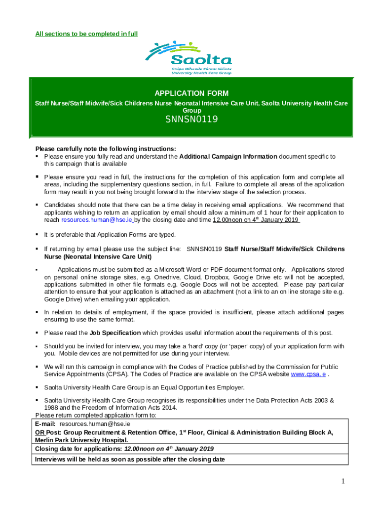 Instructions for the form Apply for Senior Staff Nurse / Midwife - Neonatal Unit