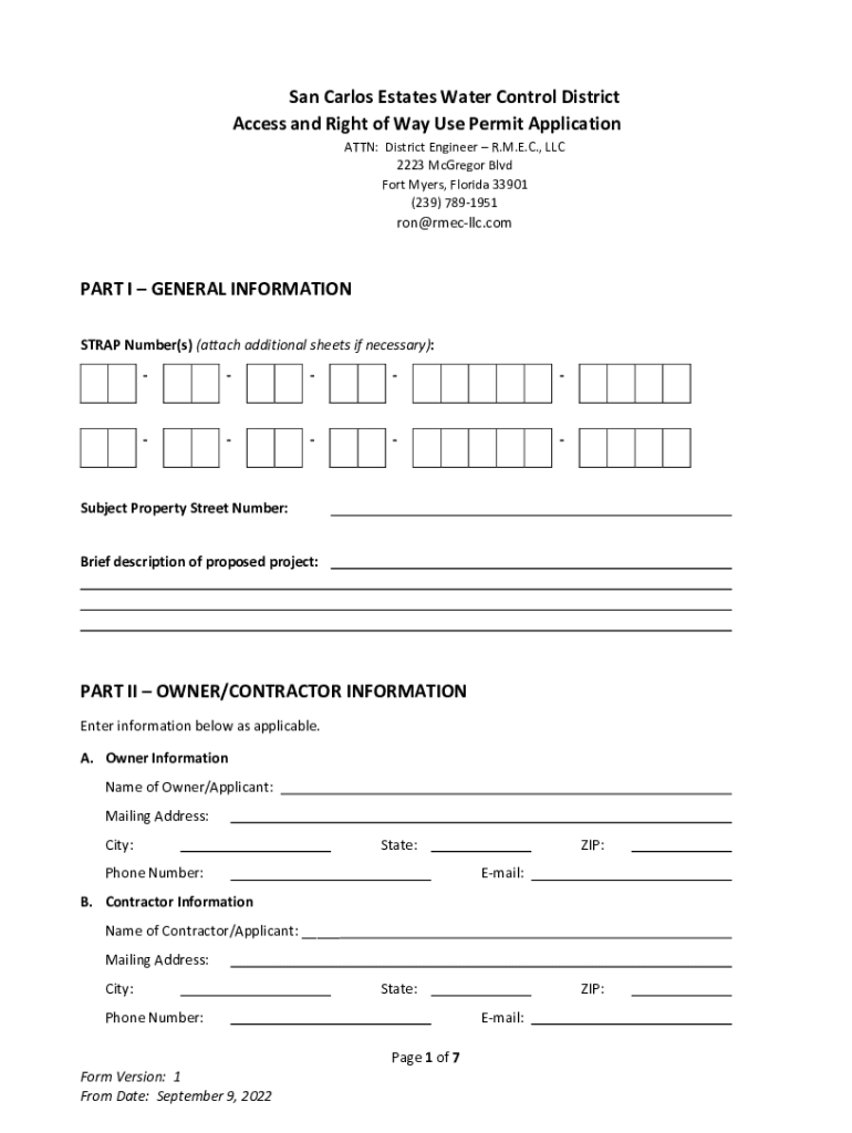 San Carlos Estates Water Control District Access and Right of Way Use Permit Application ATTN: District Engineer R.M.E.C., LLC 2223 McGregor Blvd Fort Myers, Florida 33901 (239) 7891951ron@rmecllc.comPART