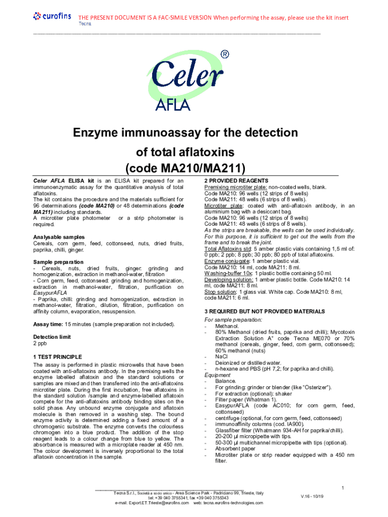 THE PRESENT DOCUMENT IS A FACSIMILE VERSION When performing the assay, please use the kit insert ___Enzyme immunoassay for the detection of total aflatoxins (code MA210/MA211) Celer AFLA ELISA kit