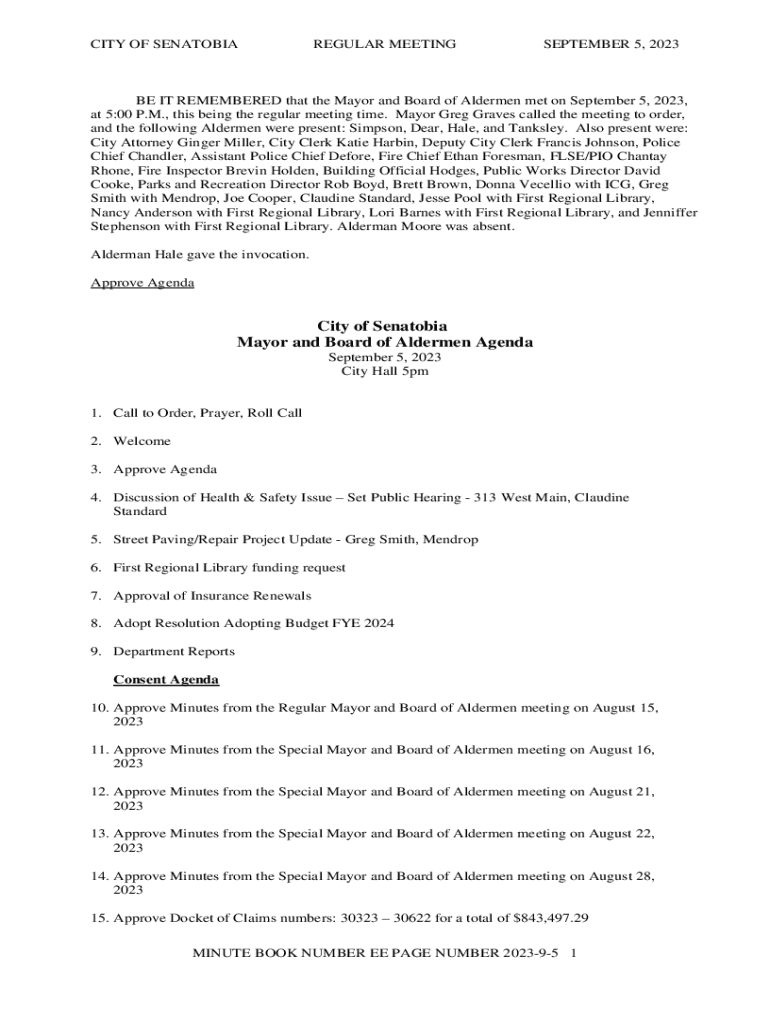 CITY OF SENATOBIAREGULAR MEETINGSEPTEMBER 5, 2023BE IT REMEMBERED that the Mayor and Board of Aldermen met on September 5, 2023, at 5:00 P.M., this being the regular meeting time. Mayor Greg Graves