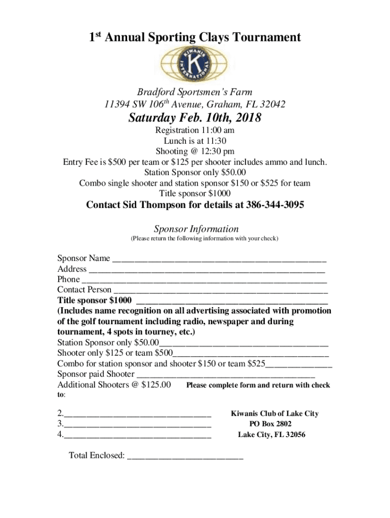 1st Annual Sporting Clays TournamentBradford Sportsmens Farm 11394 SW 106th Avenue, Graham, FL 32042Saturday Feb. 10th, 2018 Registration 11:00 am Lunch is at 11:30 Shooting @ 12:30 pm Entry Fee is