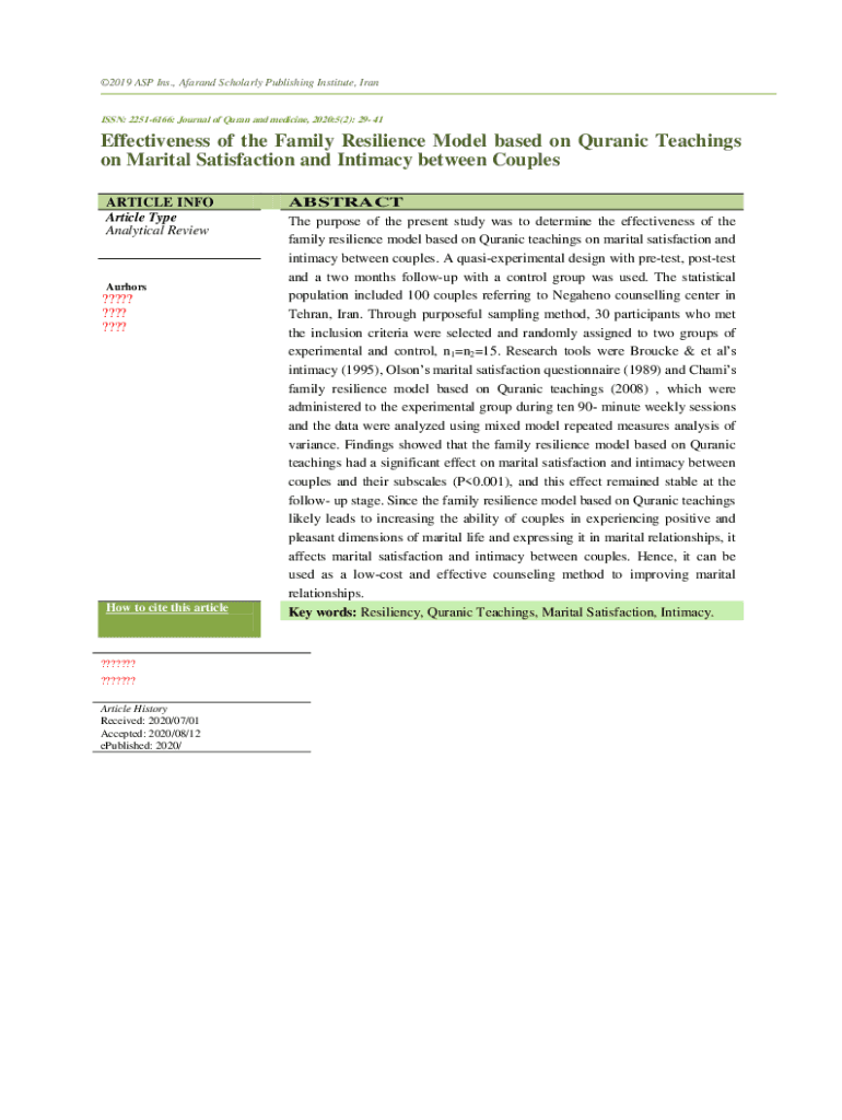 2019 ASP Ins., Afarand Scholarly Publishing Institute, IranISSN: 22516166: Journal of Quran and medicine, 2020:5(2): 29 41Effectiveness of the Family Resilience Model based on Quranic Teachings on