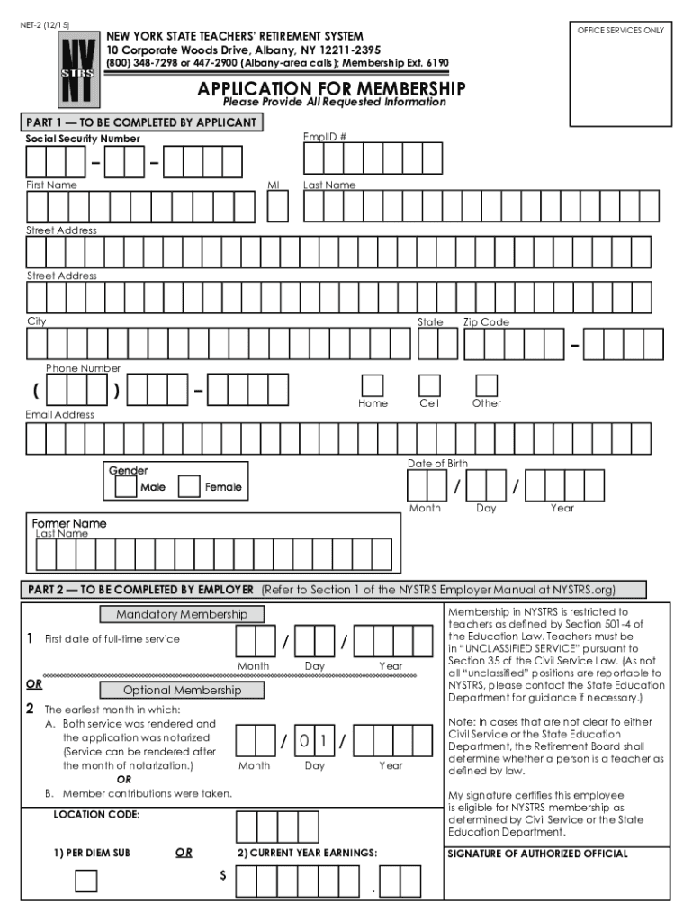 NYNET2 (12/15)STRSOFFICE SERVICES ONLYNEW YORK STATE TEACHERS RETIREMENT SYSTEM 10 Corporate Woods Drive, Albany, NY 122112395(800) 3487298 or 4472900 (Albanyarea calls); Membership Ext. 6190APPLICATION