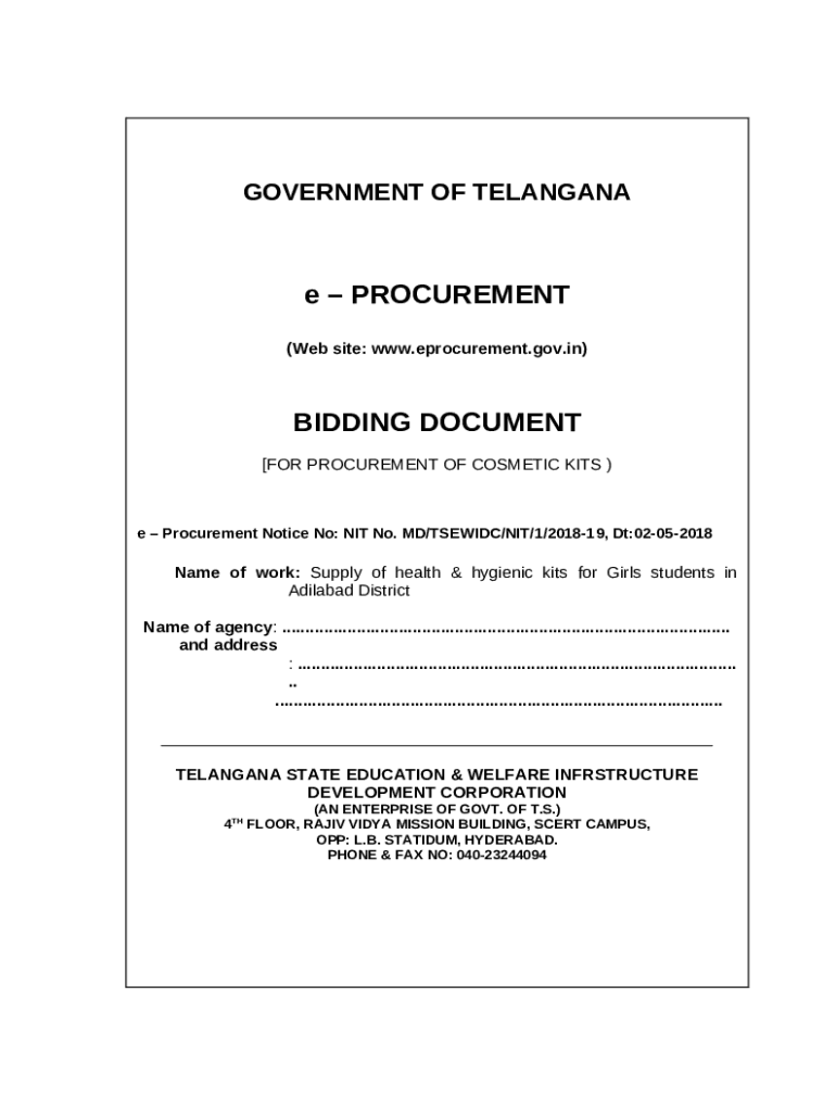 Instructions for the form Name of work: Supply of health & hygienic kits for Girls students in Adilabad District