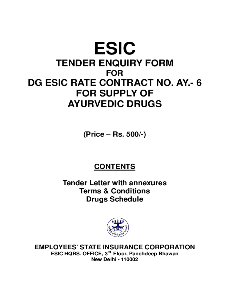 ESIC TENDER ENQUIRY FORM FORDG ESIC RATE CONTRACT NO. AY. 6 FOR SUPPLY OF AYURVEDIC DRUGS (Price Rs. 500/)CONTENTS Tender Letter with annexures Terms & Conditions Drugs ScheduleEMPLOYEES STATE INSURANCE