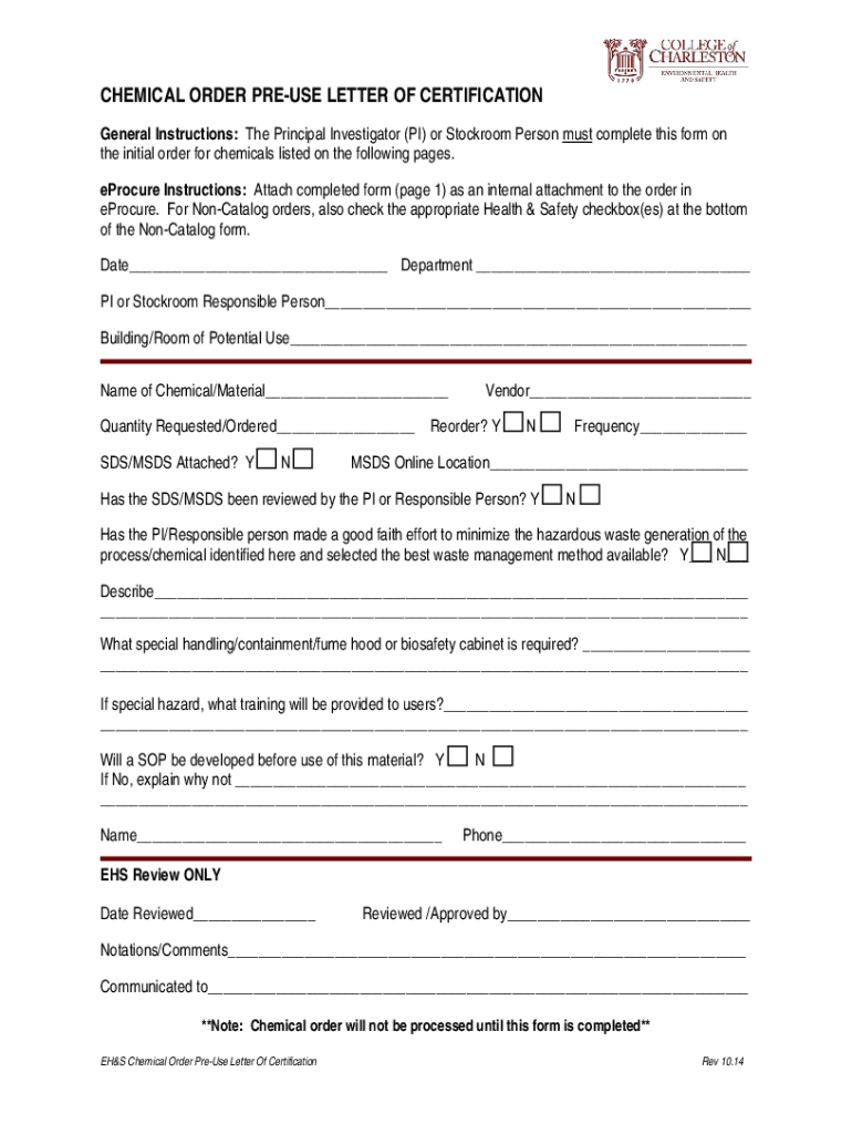CHEMICAL ORDER PREUSE LETTER OF CERTIFICATION General Instructions: The Principal Investigator (PI) or Stockroom Person must complete this form on the initial order for chemicals listed on the following