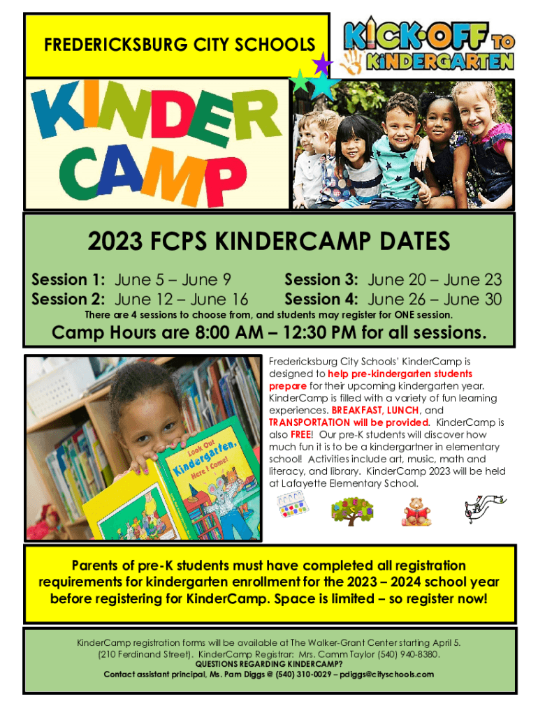 FREDERICKSBURG CITY SCHOOLS20212023 FCPS KINDERCAMP DATES Session 1: June 5 June 9 Session 2: June 12 June 16Session 3: June 20 June 23 Session 4: June 26 June 30There are 4 sessions to choose from,