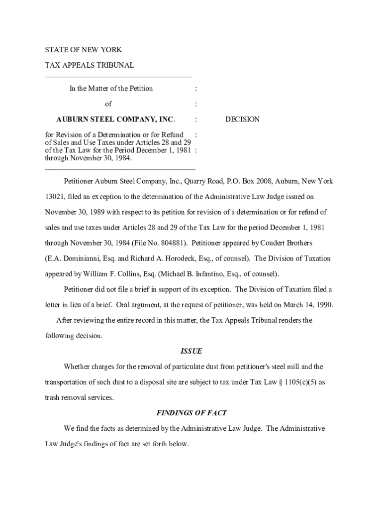 STATE OF NEW YORK TAX APPEALS TRIBUNAL ___ In the Matter of the Petition:of:AUBURN STEEL COMPANY, INC.:DECISIONfor Revision of a Determination or for Refund : of Sales and Use Taxes under Articles