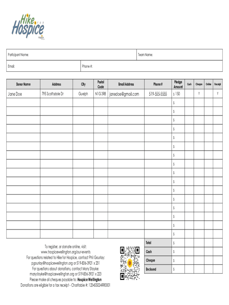 Participant Name:Team Name:Email:Phone #:Donor NameJane DoeAddress795 Scottsdale DrCityPostal CodeGuelphN1G 3R8Email Addressjanedoe@gmail.comPhone #5195555555Pledge Amount $ $ $ $ $ $ $ $ $ $ $ $