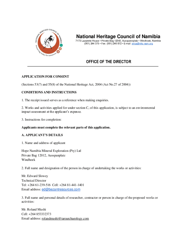 National Heritage Council of Namibia 7173 Lazarette House Private Bag 12043, Ausspannplatz Windhoek, Namibia (061) 244 375 Fax: (061) 246 872 Email: erica@nhcnam.orgOFFICE OF THE DIRECTORAPPLICATION