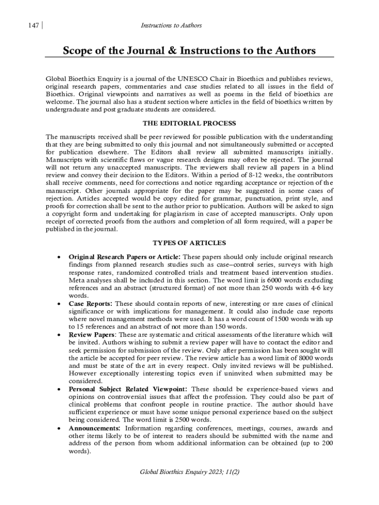 147Instructions to AuthorsScope of the Journal & Instructions to the Authors Global Bioethics Enquiry is a journal of the UNESCO Chair in Bioethics and publishes reviews, original research papers,