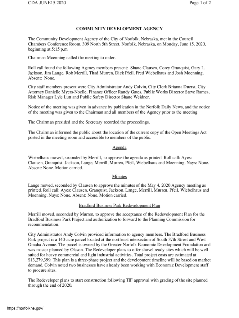The Community Development Agency of the City of Norfolk, Nebraska, met in the Council