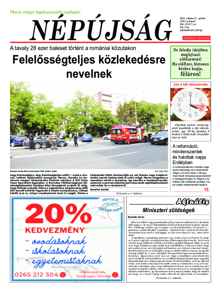 2023. oktber 27., pntek LXXV. vfolyam 246. (21517.) sz. ra: 4 lej (elfizetknek 2,26 lej)A tavaly 28 ezer baleset trtnt a romniai kzutakonFelelssgteljes kzlekedsre nevelnekNe feledje idejben megjtani