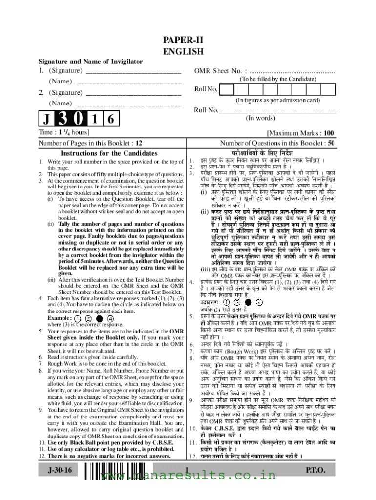 PAPERII ENGLISH Signature and Name of Invigilator 1. (Signature) ___OMR Sheet No. : ............................................... (To be filled by the Candidate)(Name) ___ 2. (Signature) ___ (Name)